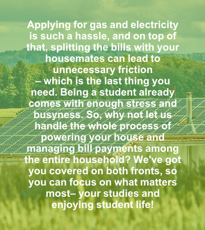 Applying for gas and electricity is such a hassle, and on top of that, splitting the bills with your housemates can lead to unnecessary friction– which is the last thing you need. Being a student already comes with enough stress and busyness. So, why not let us handle the whole process of powering your house and managing bill payments among the entire household? We've got you covered on both fronts, so you can focus on what matters most– your studies and enjoying student life!