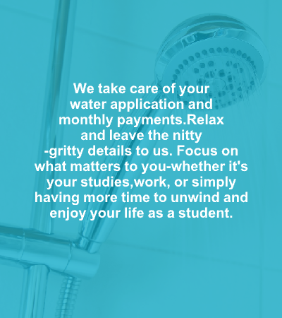We take care of your water application and monthly payments.Relax and leave the nitty-gritty details to us. Focus on what matters to you-whether it's your studies,work, or simply having more time to unwind and enjoy your life as a student.